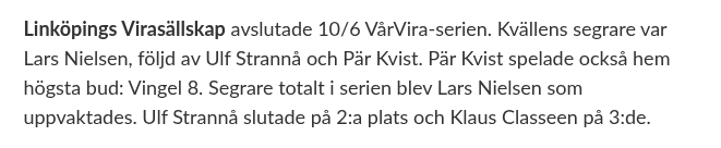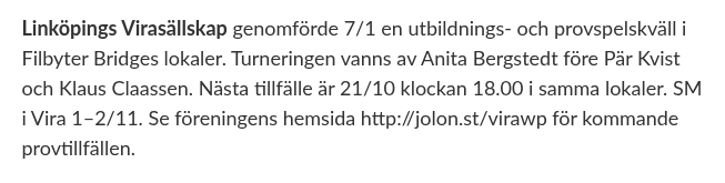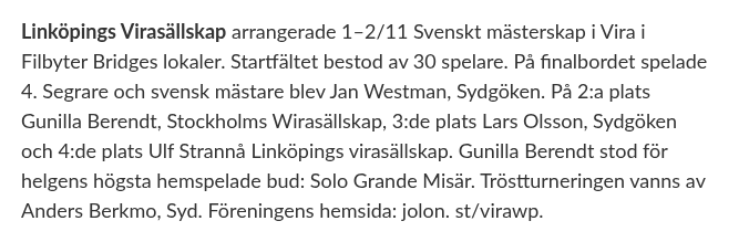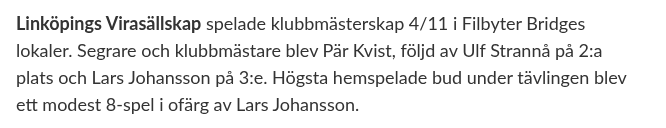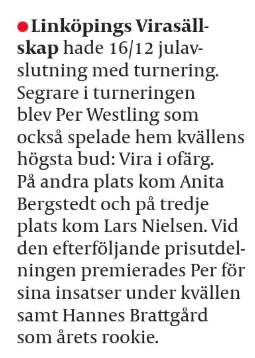 Linköpings Virasällskap spelade 18 mars andra steget i sin VårVira serie. Spelet genomfördes i Filbyter Bridge’s lokaler där även nybörjarintroduktion skedde.